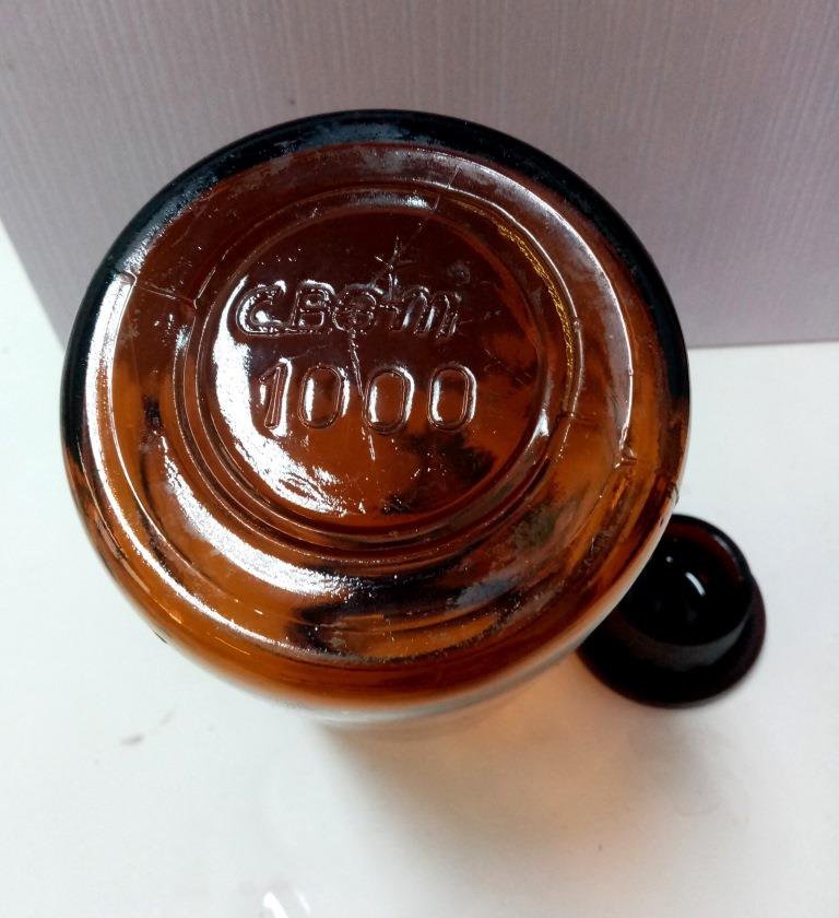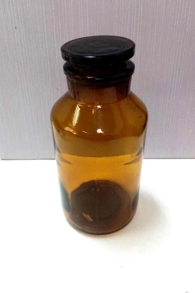 Банка скляна для хімікатів, які при зберіганні потрібно надійно герметизувати. Темно-коричневе скло, об'єм 1000 мл, широке горло з шліфом і пришліфованою пробкою.