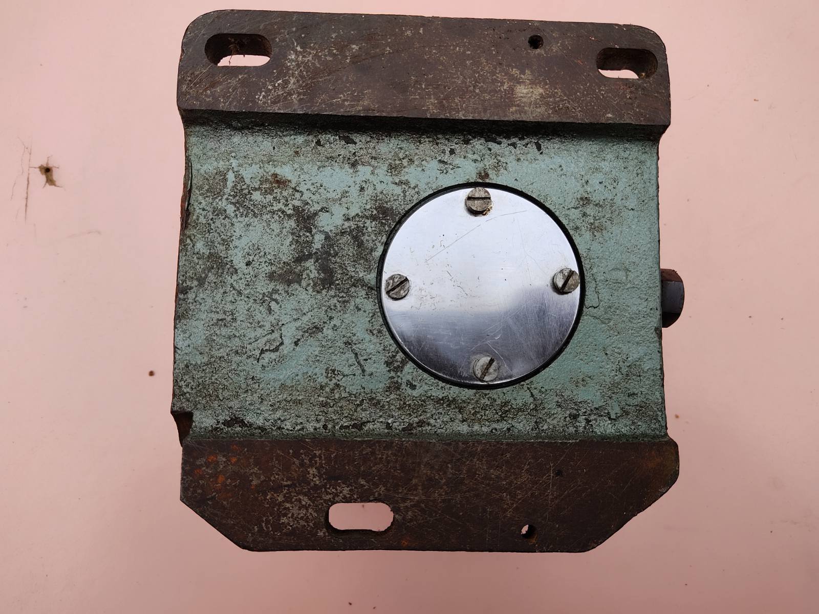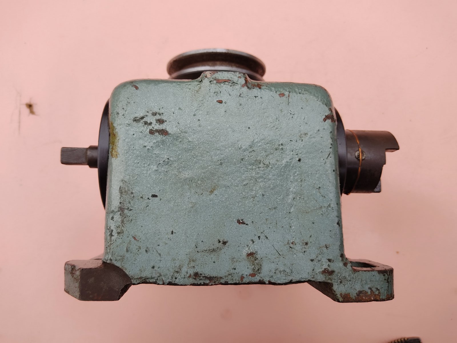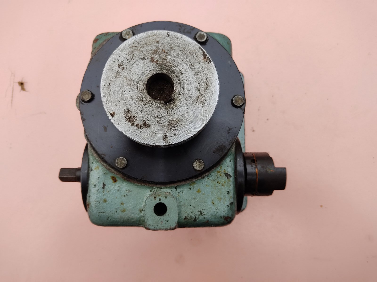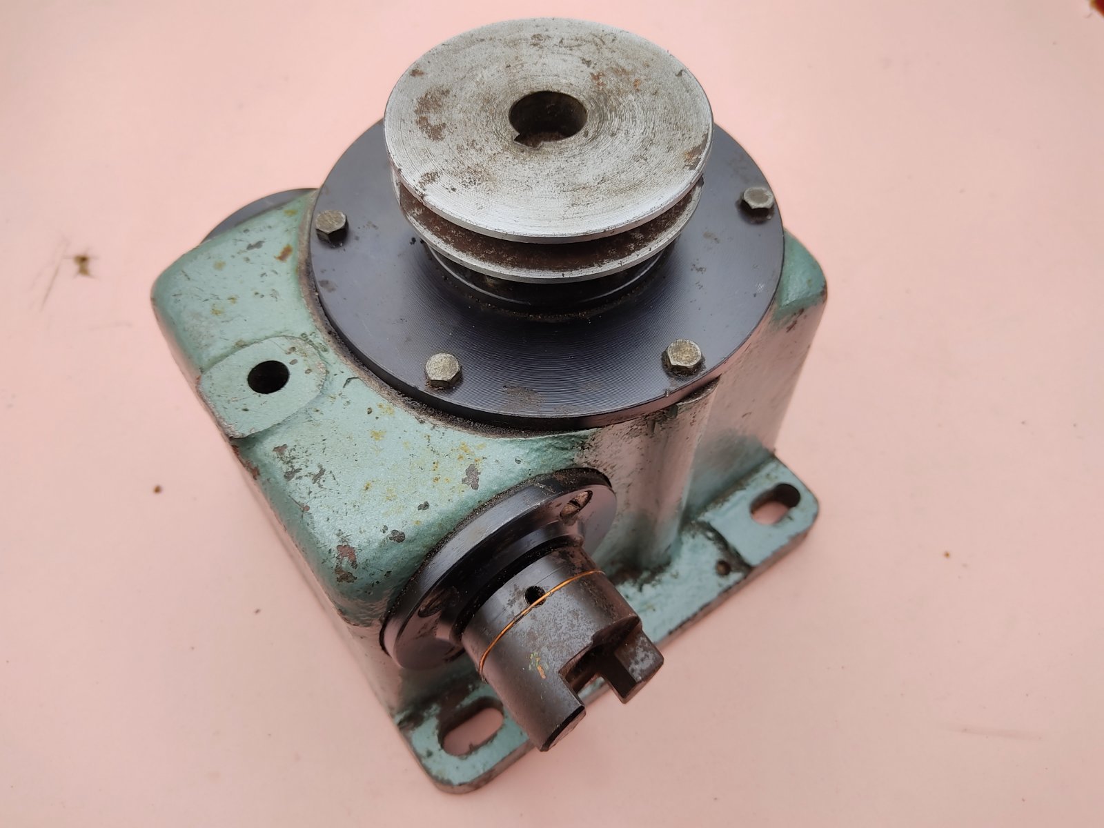 Редуктор 14:1 (14 обертів квадрата під ручку = 1 оборот шківа), габарити 195х170х165 мм, вага 10 кг. Скоріш за все до якогось верстатного оснащення, бо колір фарби такий самий як на радянських УДГ.