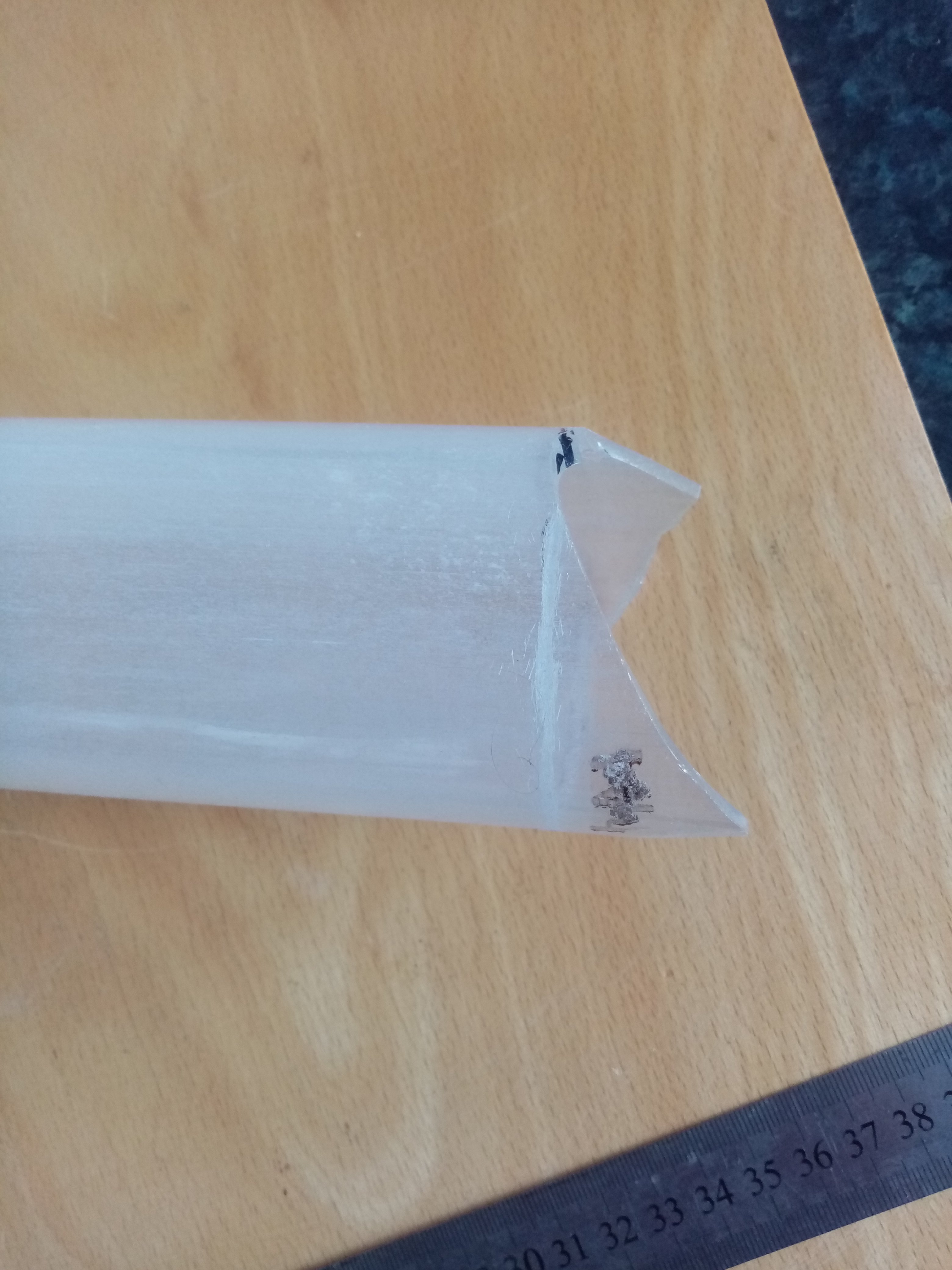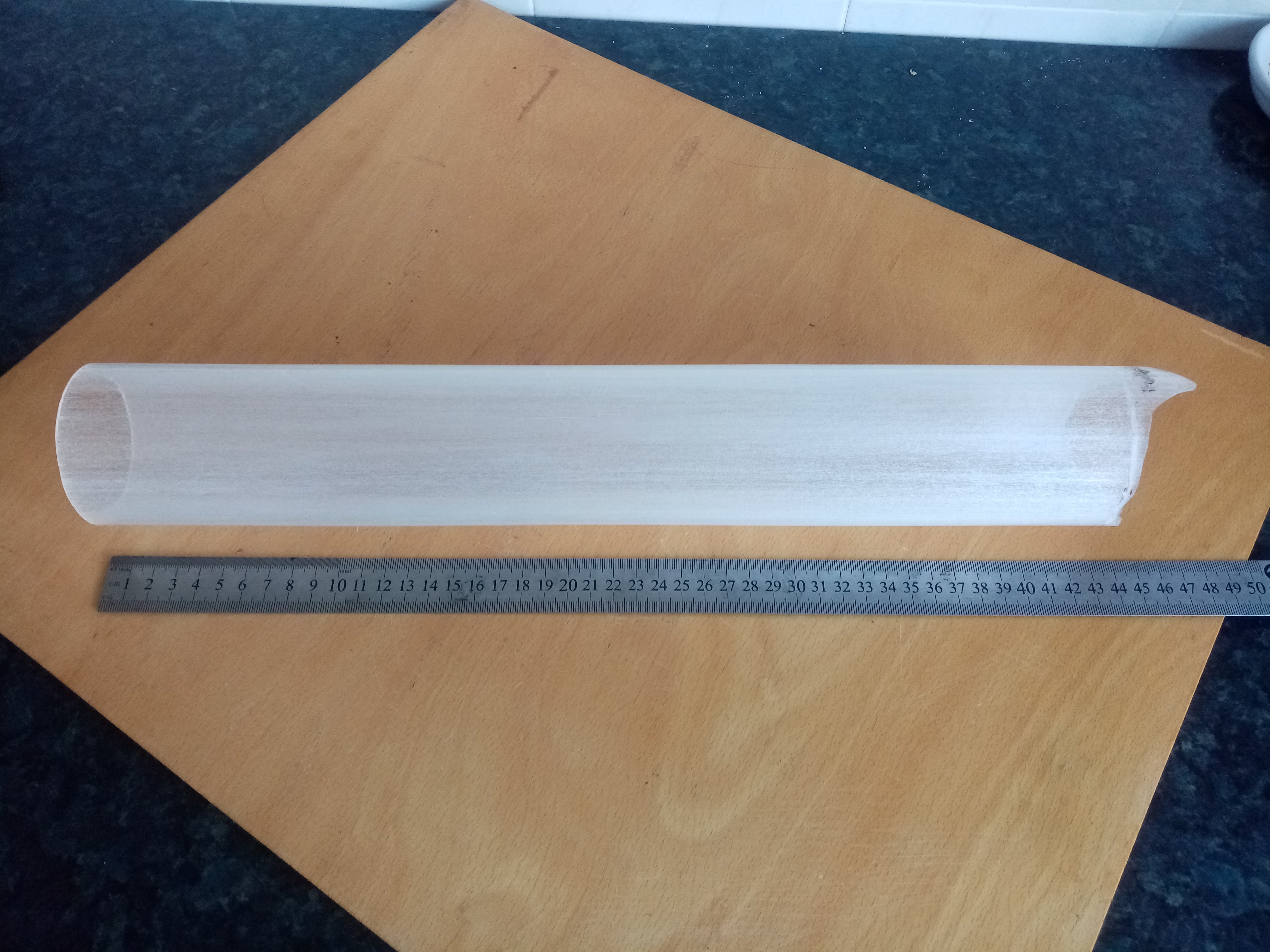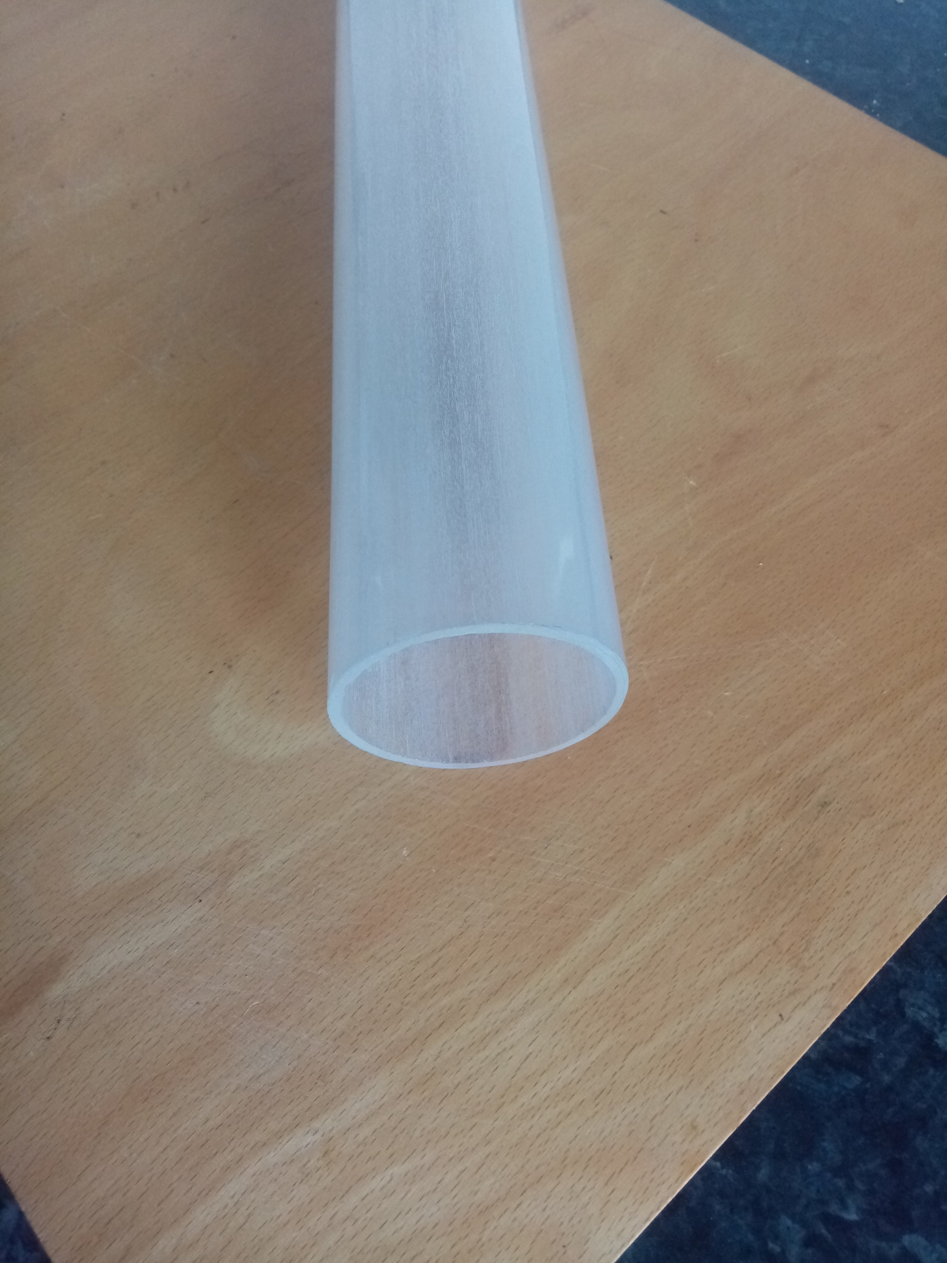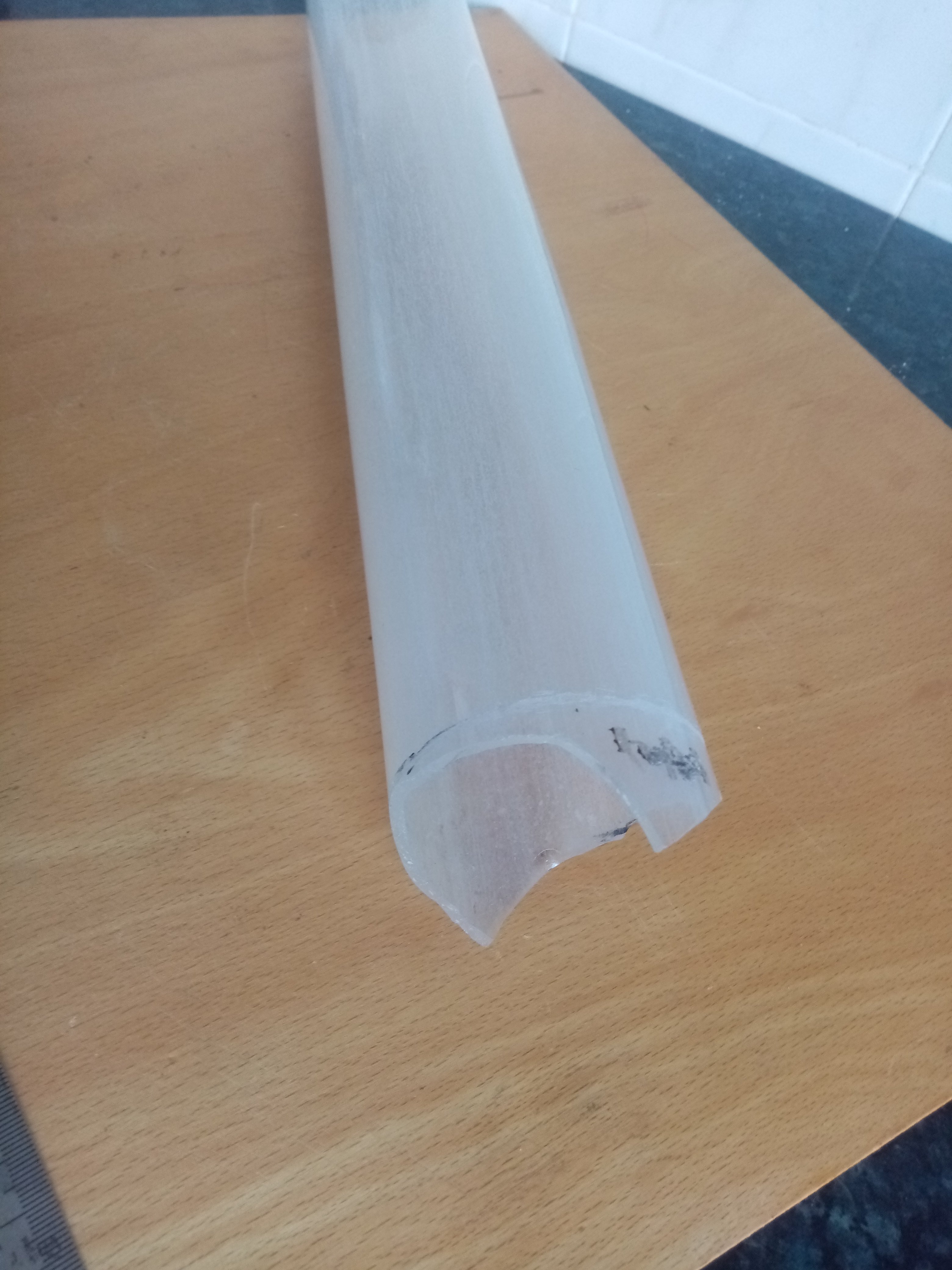 Труба з високотемпературного кварцевого скла. Зовнішній діаметр 69,5 мм, внутрішній 62 мм. Один кінець, як видно на фото, труба має не рівний край. Довжина до місця обрізки з одного кінця 430 мм. Почав обпилювати цей нерівний кінець алмазним надфілем (цей круговий надпил видно на фото), але на то не вистачило терпіння і часу. Може знадобитись для виготовлення високотемпературної трубчатої печі, або для виготовлення "козла" для обігріву та ін.