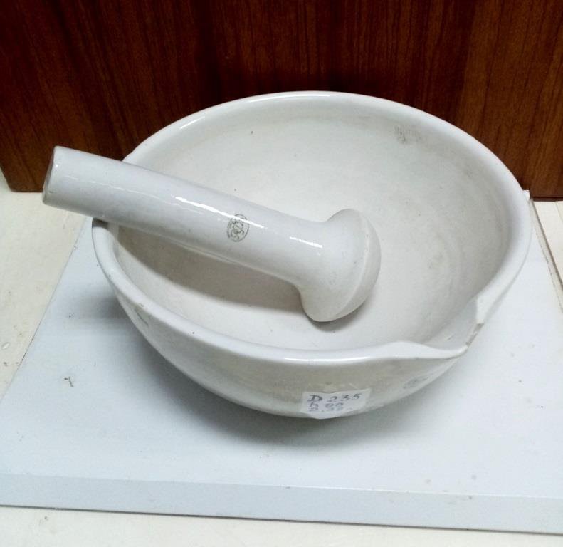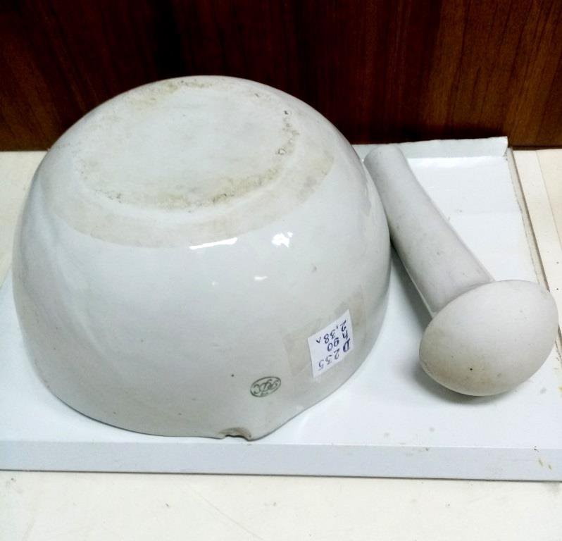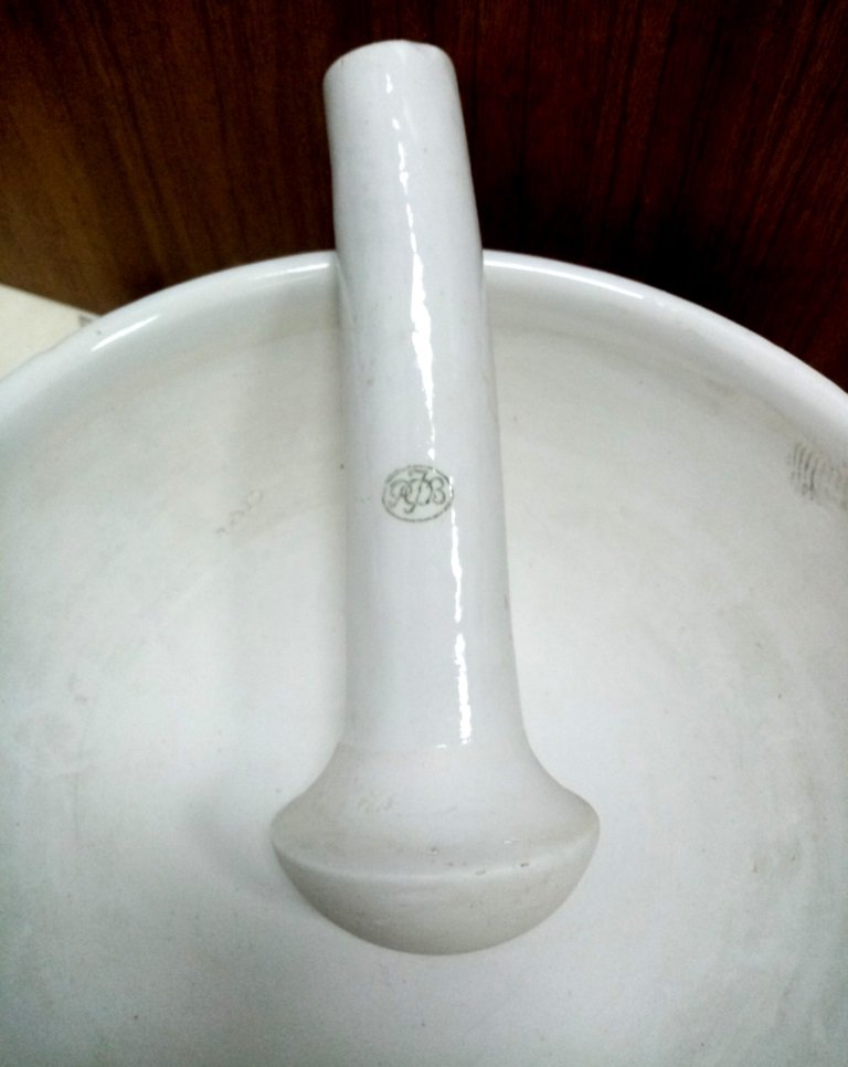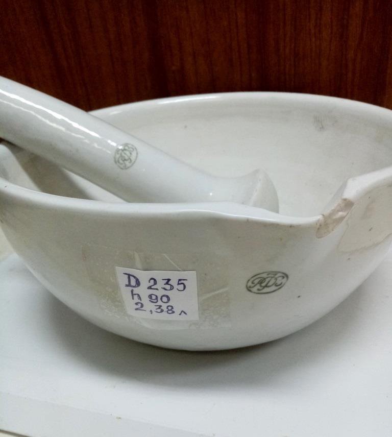 Ступа фарфорова (порцелянова, гжель) велика з пестиком. Діаметр ступи зверху 235 мм, глибина 90 мм, води в неї входить 2,38 л. Має невеликий дефект - незначний скол на зовнішній поверхні під носиком. Але цей скол не заважає нормально зливати рідину через носик.