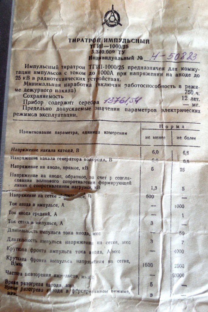 Імпульсний тиратрон ТГИ1-1000/25 призначений для комутації імпульсів з струмом до 1000 А при напрузі на аноді до 25 кВ. В упаковці, з паспортом. Згідно паспорту містить в собі 13,762 г срібла.