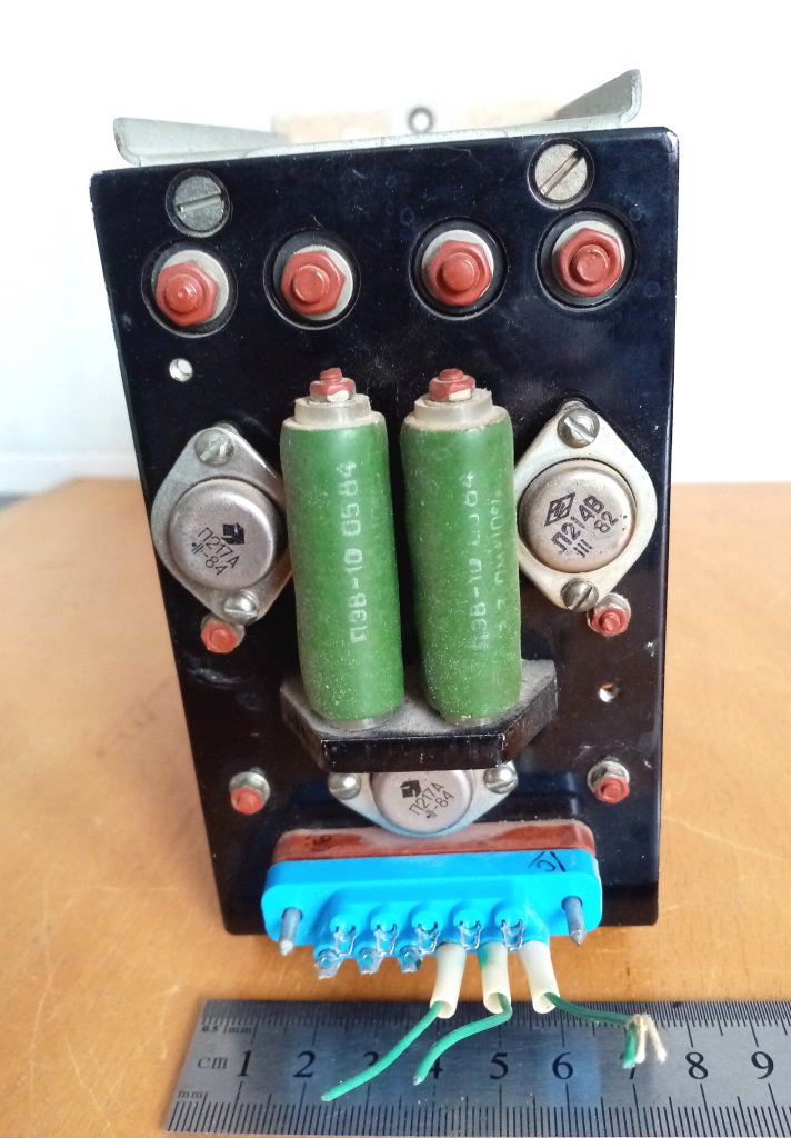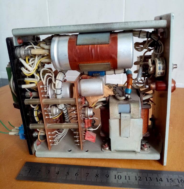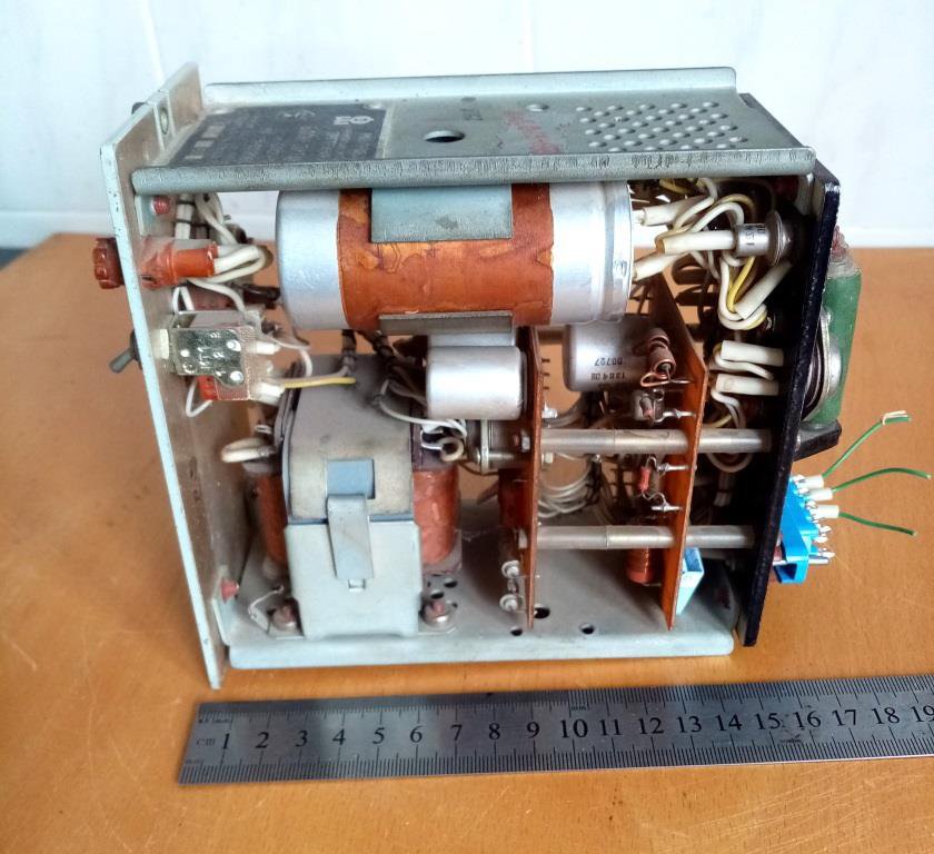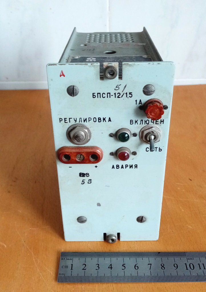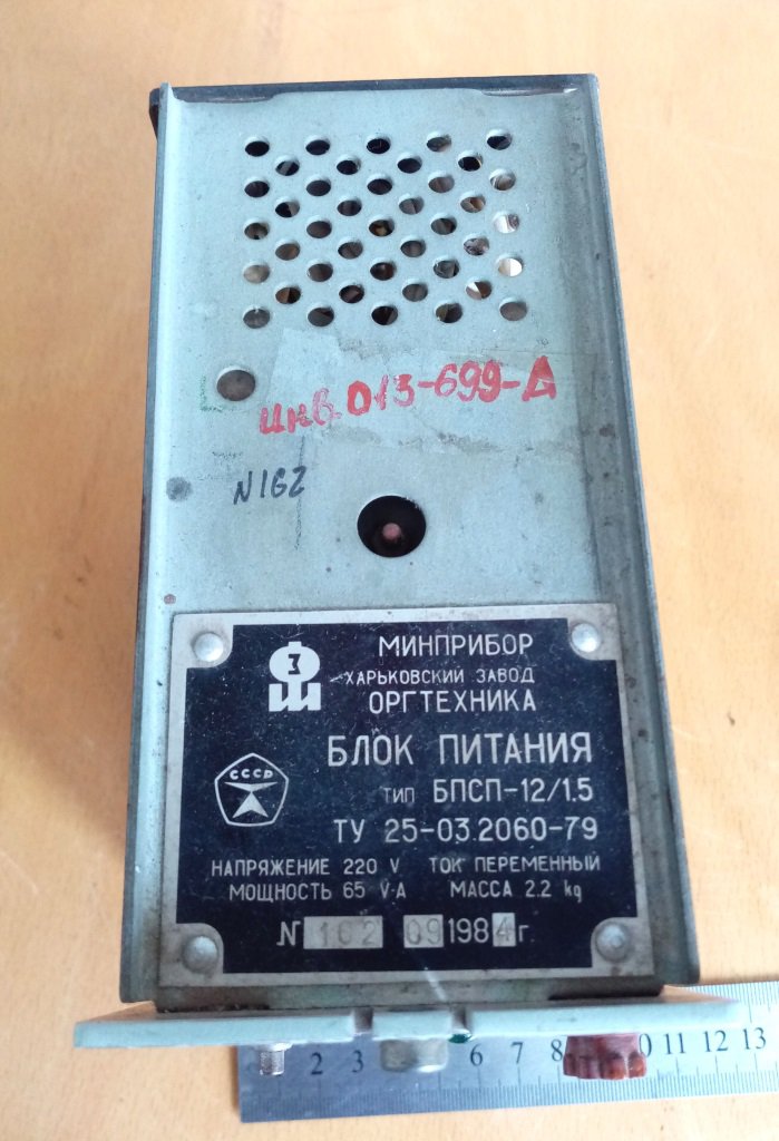 Блок живлення БПСП-5/1,5. На шильдику вказано БПСП -12/1.5, але експериментальна перевірка показала, що на виході 5 В. З деталей найбільш цінним в цьому блоці є реле РЕС-9, що містить ДГМ і на скупці його можна здати за суму, що суттєво перевищує половину вказаної ціни всього блоку, а також хороший транс та і інші деталі. Їх видно на фото, зроблених з різних ракурсів. Але розбирати на деталі не хочеться, можливо комусь знадобиться за основним призначенням як блок живлення.