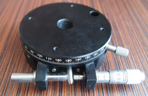 дуже маленький і дуже добротний поворотний стіл, люфти руками не відчуваються, крутиться дуже плавно і гладко. Діаметр 90мм, висота - 30мм. Отвори під кріплення столика під болт М5, відстань між отворами кріплення - 50мм,центральний отвір - 13мм. Також є отвори для кріплення деталі М3. Тонка подача реалізована мікрометричною головкою.3 200,00гр