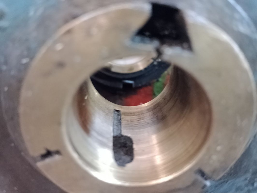 На всех чертежах и фотографиях ТВ-16, которые нашёл на форумах, передняя втулка регулируется клином с углом (примерно 30–60°). У меня же никакого клина нет. Паз выполнен как обычный прямой (по сути 90°), и вместо клина стоял небольшой обточенный болт. Он немного распирал втулку — это видно по следам замятости на бронзе, то есть какую-то функцию он выполнял. Но площадь контакта там минимальная, фактически точечная.